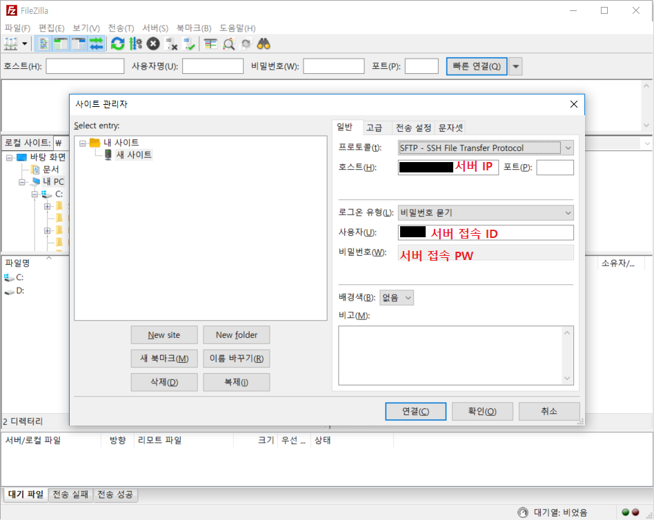 - 상단 메뉴 -> [파일] -> [사이트 관리자] -> [New Site] 클릭