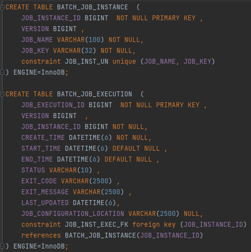 - spring-batch-core 라이브러리 내부에 schema-*.sql 파일의 데이터베이스 종류별 메타 데이터 스키마가 존재