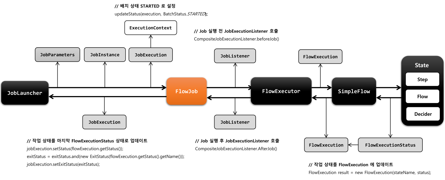 - Flow 와 Job 의 흐름에만 관여하고 비지니스로직은 Step 에서 동작