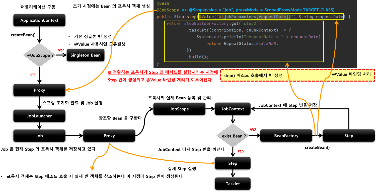 - @JobScope, @StepScope 어노테이션이 선언되면 내부적으로 Bean 의 Proxy 객체가 생성 -> Job 실행 시 Proxy 객체가 실제 Bean 을 호출하여 해당 메소드를 실행