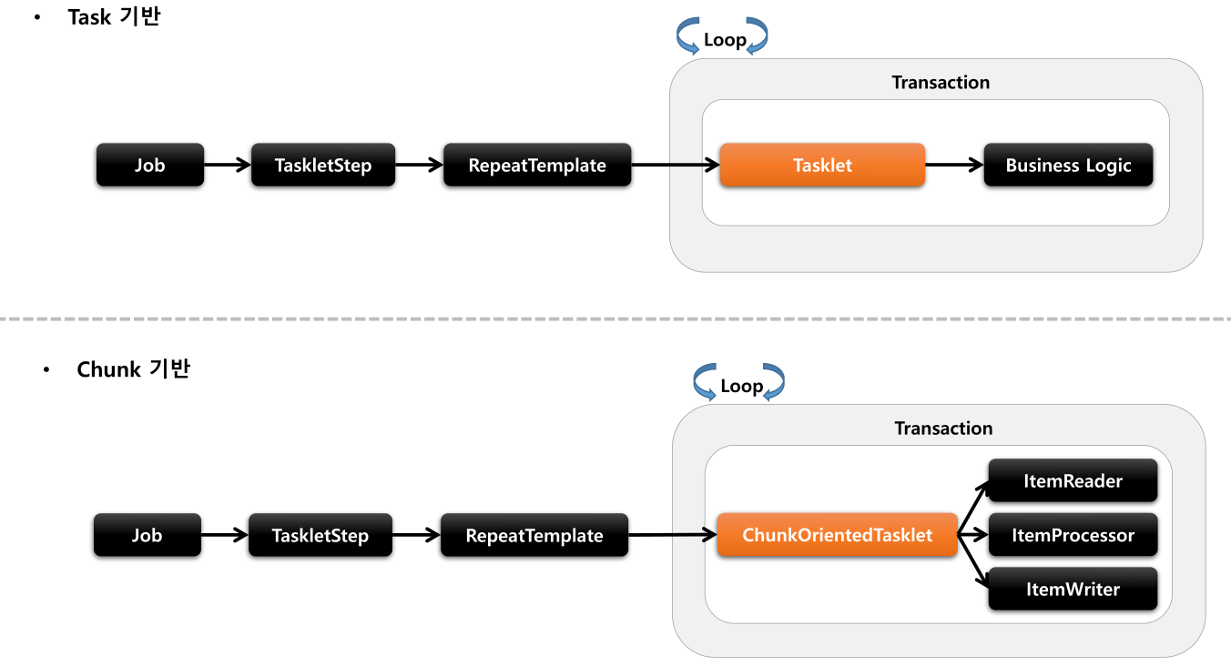- 스프링 배치에서 Step 의 실행 단위는 2가지로 나누어짐.