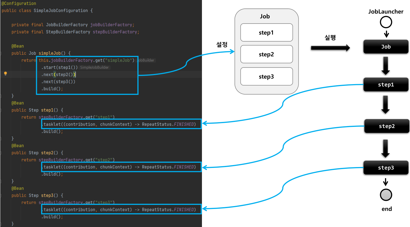 - jobBuilderFactory.get("jobName") -> "jobName" 은 스프링 배치가 Job 을 실행시킬 때 참조하는 Job 이름