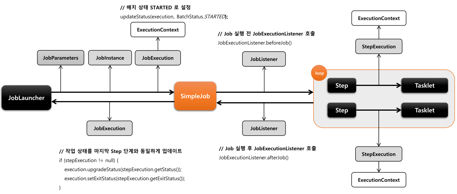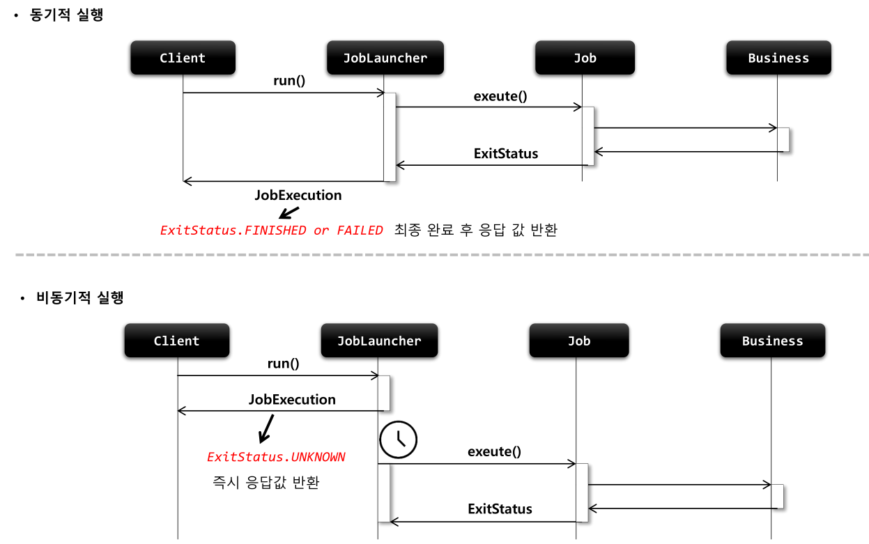 - Job 과 JobParameters 를 인자로 받아 배치를 수행하고 끝나면 JobExecution 을 Return
