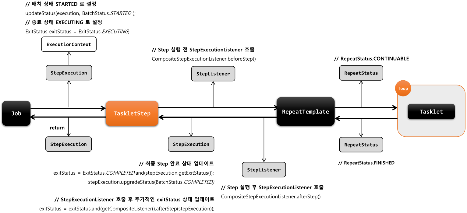 - Step 의 구현체 중 하나로 Tasklet 을 실행시키는 도메인 객체
