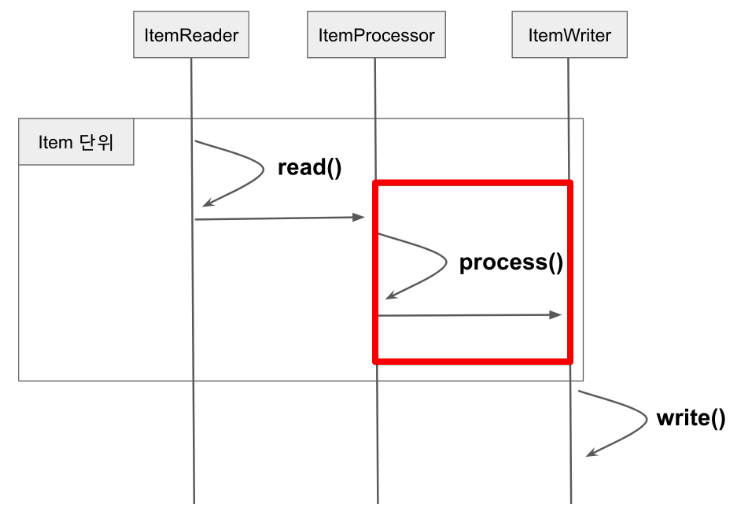 - ItemReader 를 통해 각 항목을 개별적으로 읽고 이를 처리하기 위해 ItemProcessor 로 전달