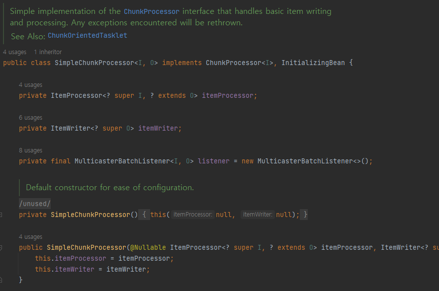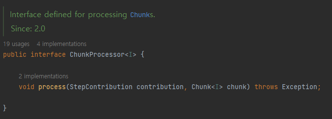 - 인터페이스이기 때문에 실제 구현체가 필요(기본적으로는 SimpleChunkProcessor)