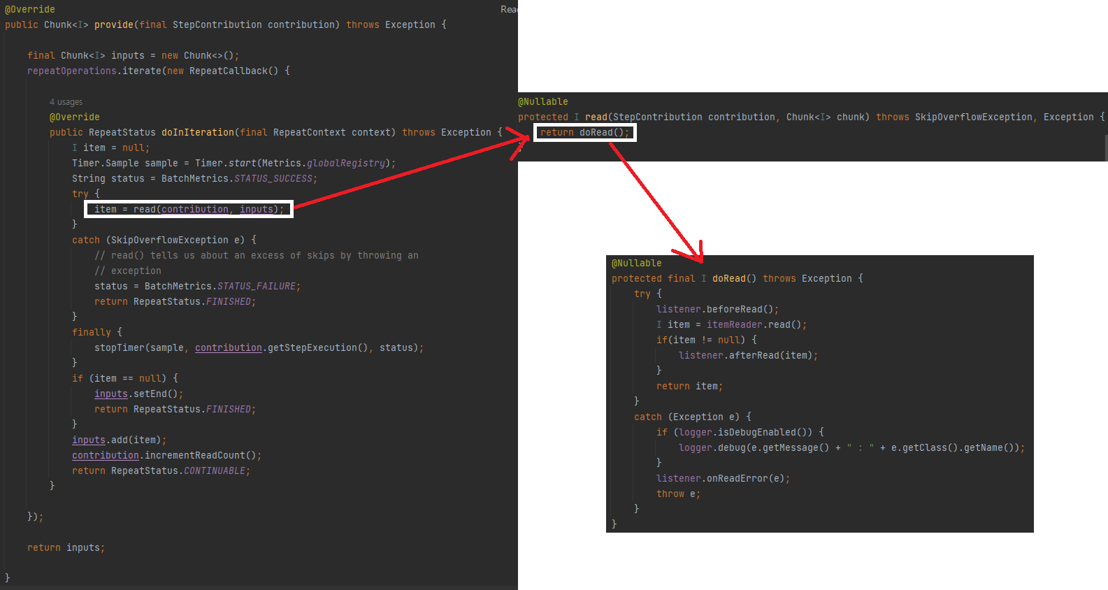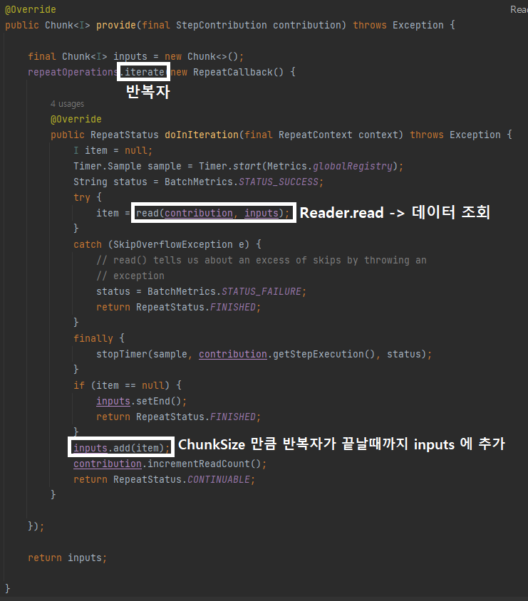 - 내부적으로 반복문을 사용해서 ItemReader.read() 를 계속 호출하여 item 을 Chunk 에 쌓음
