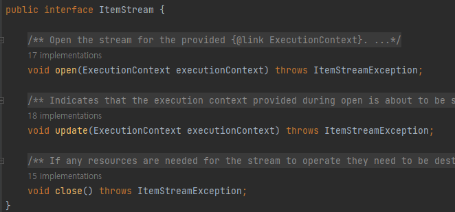- ItemStream 은 3개의 메소드 존재 -> open(), close() 스트림을 열고 닫음 / update() Batch 처리의 상태를 업데이트