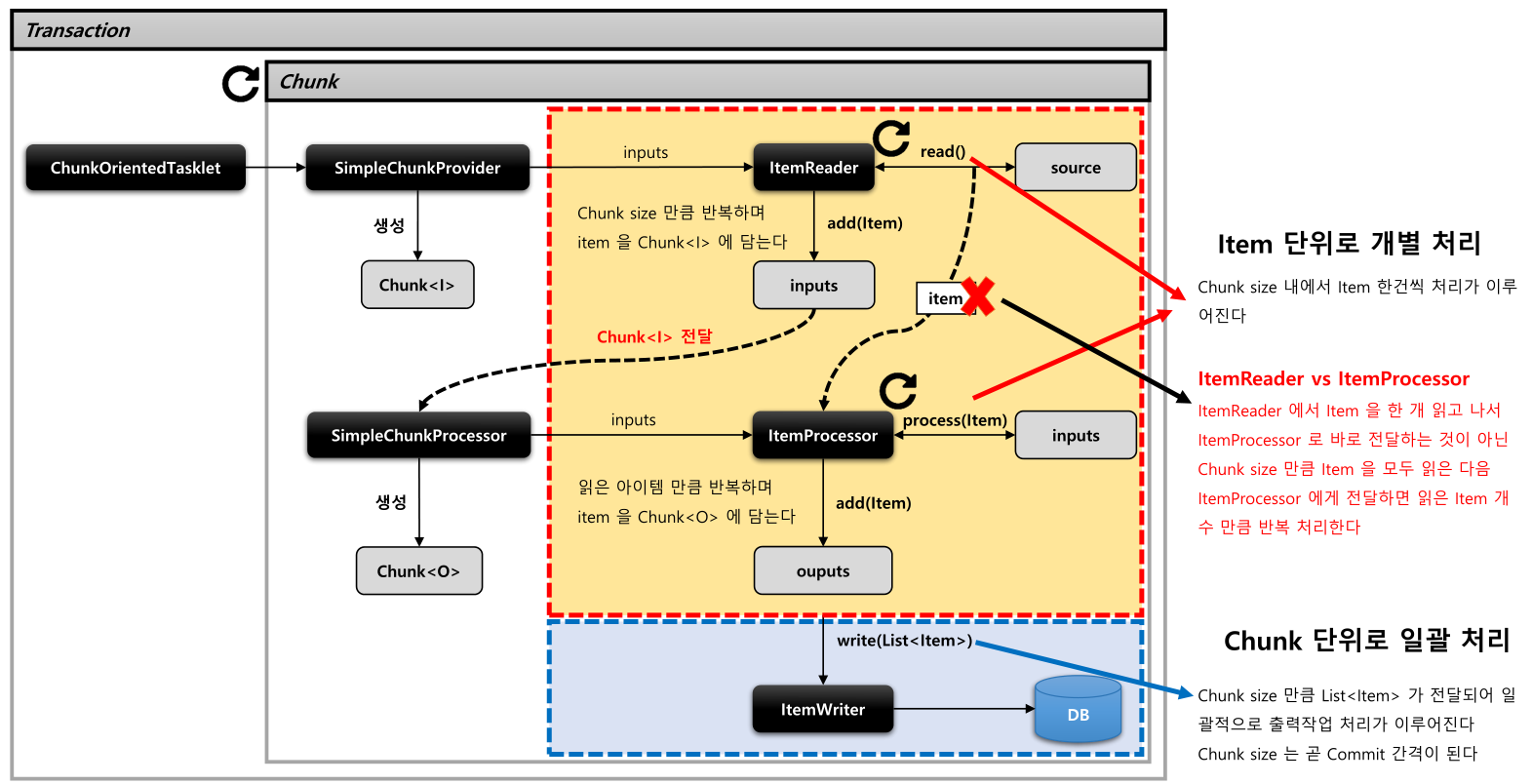 - 한번에 하나씩 아이템을 입력 받아 Chunk 단위의 덩어리로 만들고 Chunk 단위로 트랜잭션을 처리함 -> Chunk 단위로 Commit 과 Rollback 이 진행