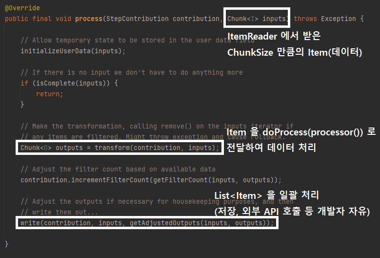 - ChunkSize 만큼 item 을 읽으면 반복문 종료 후 ChunkProcessor 수행
