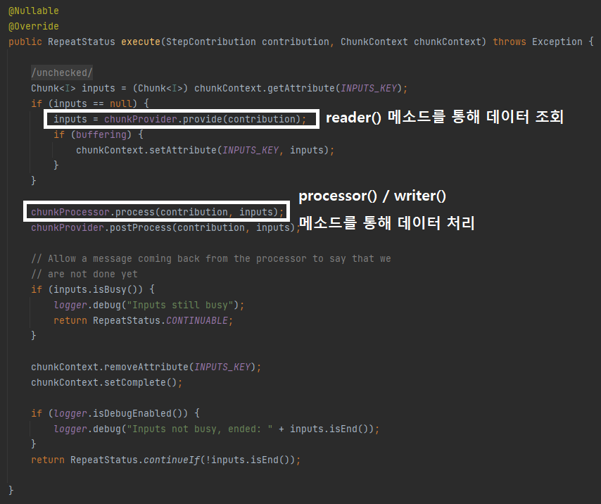 - chunkProcessor.process() 에서 reader 로 받은 데이터를 가공(Processor) / 저장(Writer) 수행