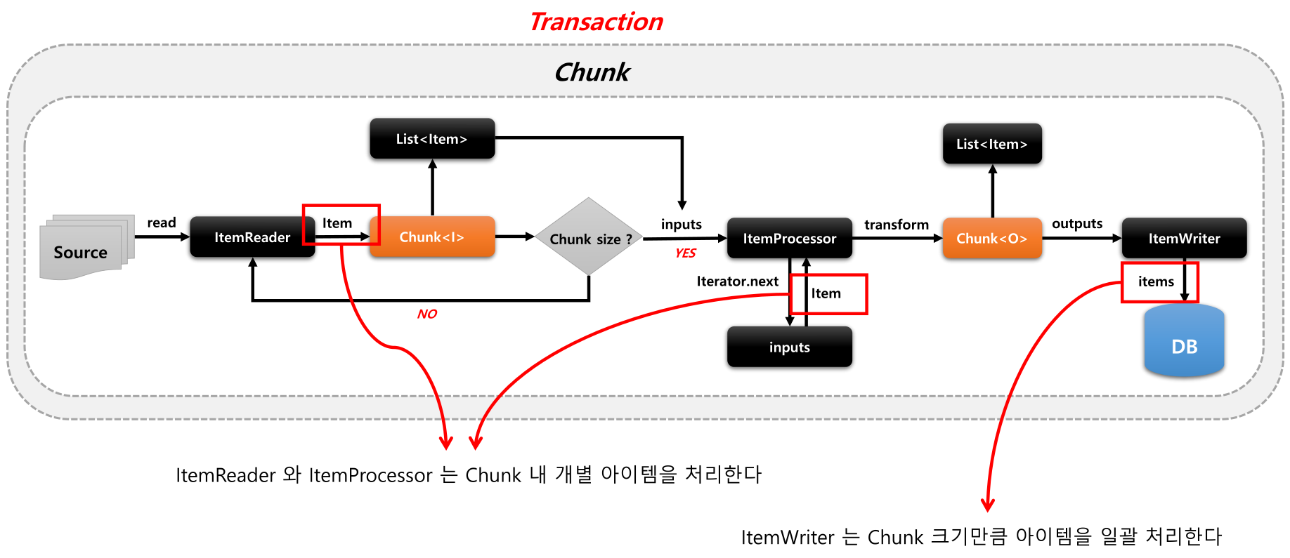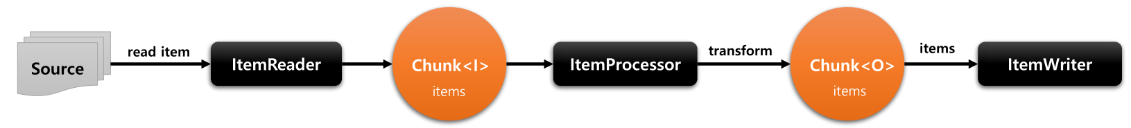 - ItemReader 를 사용해서 소스로부터 Item 을 ChunkSize 만큼 읽어서 Chunk 단위로 만들어 제공