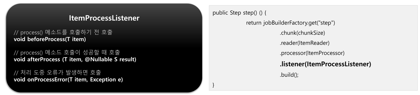 - ItemProcessListener -> ItemProcessor 실행 전후, 오류 시점(But, Item 이 Null 인 경우 호출 안 됨)