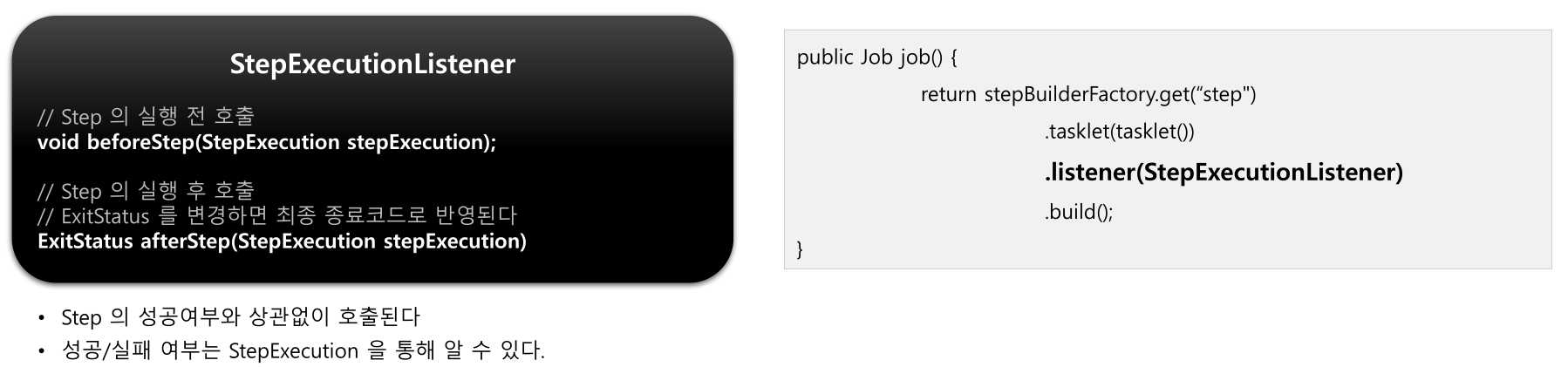 - StepExecutionListener -> Step 실행 전후
