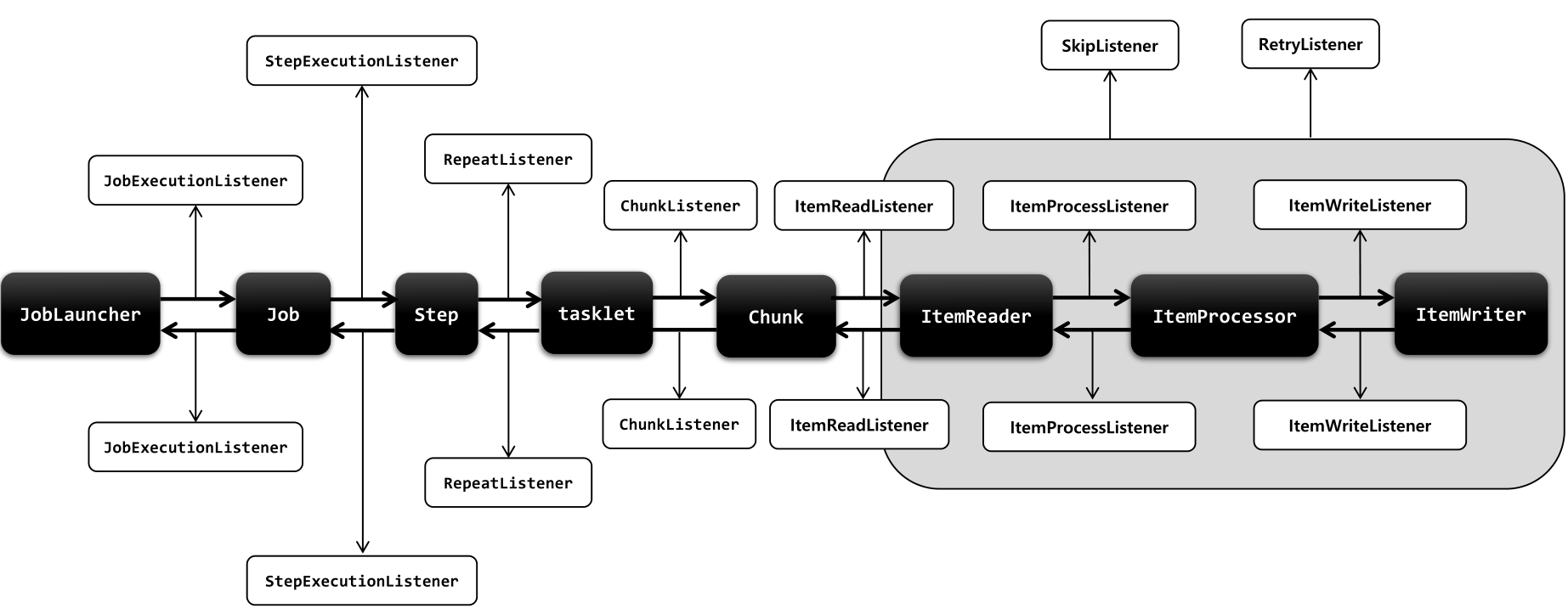 - 배치 흐름 중에 Job, Step, Chunk 단계의 실행 전후에 발생하는 이벤트