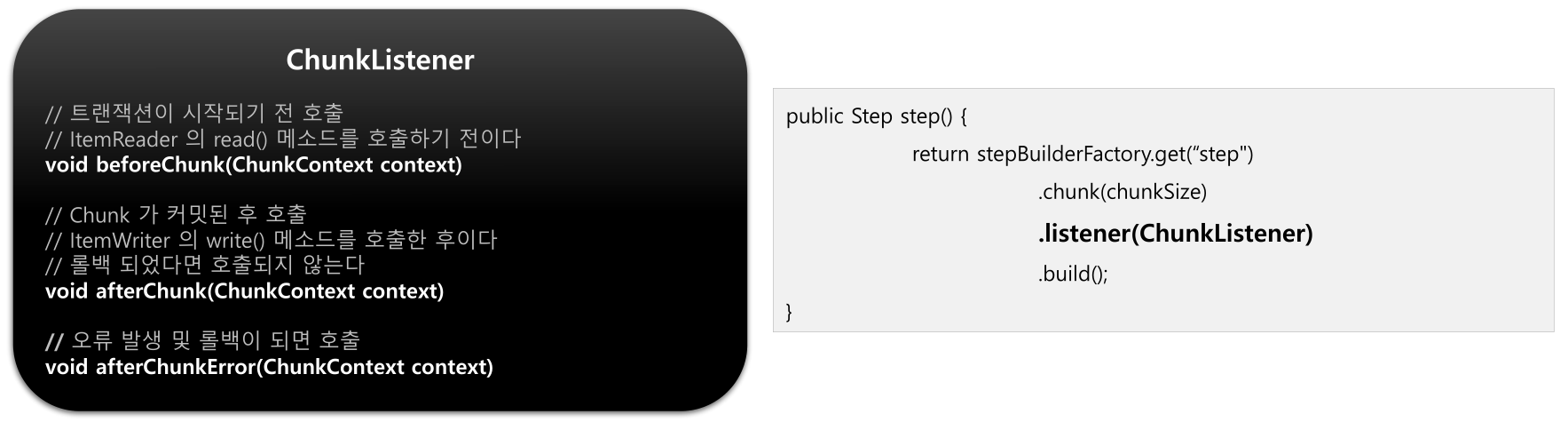 - ChunkListener -> Chunk 실행 전후(Tasklet 실행 전후), 오류 시점