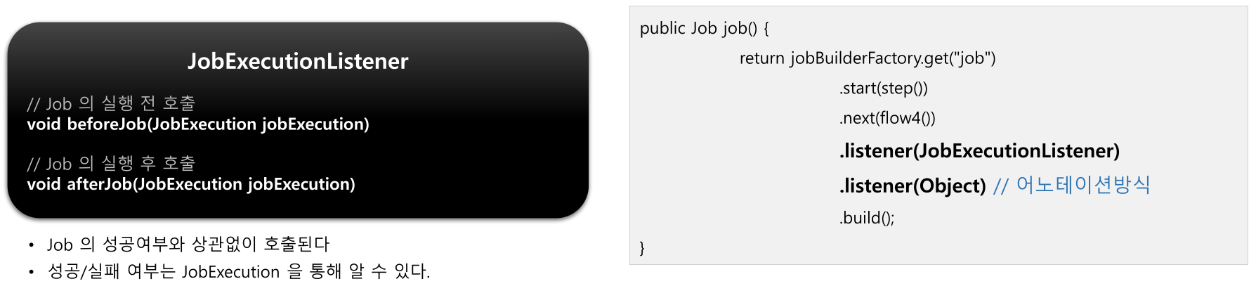 - JobExecutionListner -> Job 실행 전후 - Step