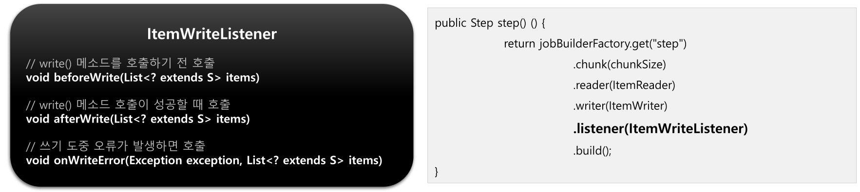 - ItemWriterListener -> ItemWriter 실행 전후, 오류 시점(But, Item 이 Null 인 경우 호출 안 됨) - SkipListener