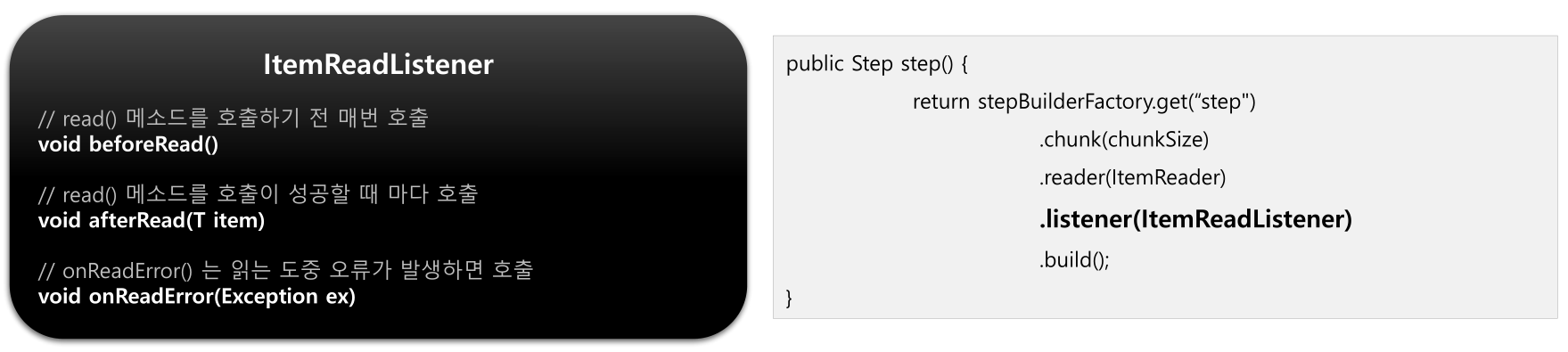 - ItemReaderListener -> ItemReader 실행 전후, 오류 시점(But, Item 이 Null 인 경우 호출 안 됨)