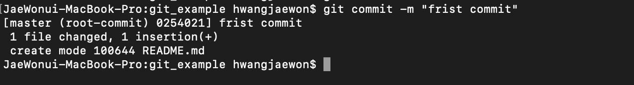 - git commit -m "first commit" ( -m -> 메시지를 입력하겠다. "first commit" -> 메시지 내용(원하는 메시지를 아무렇게나 입력하시면 됩니다.))