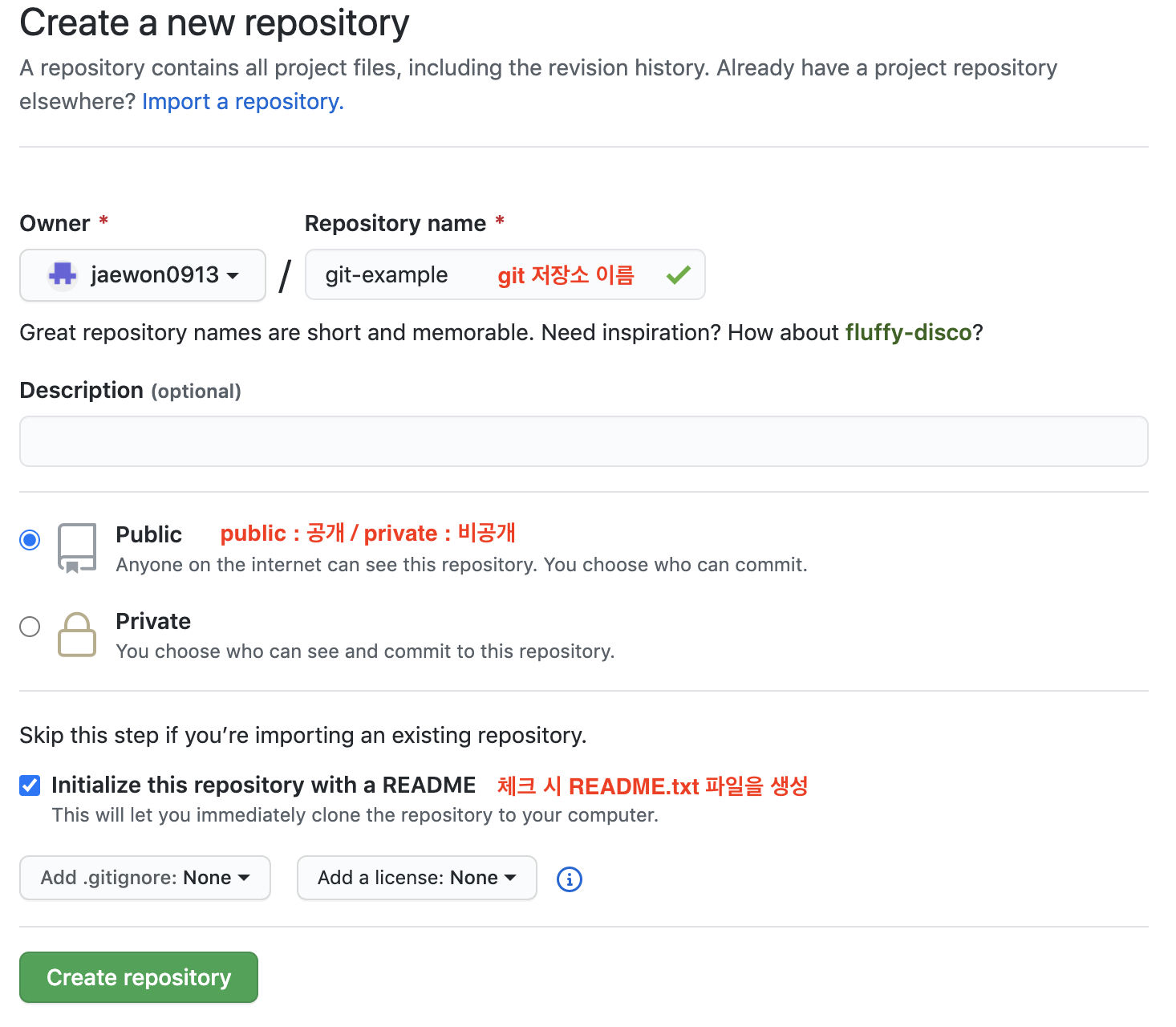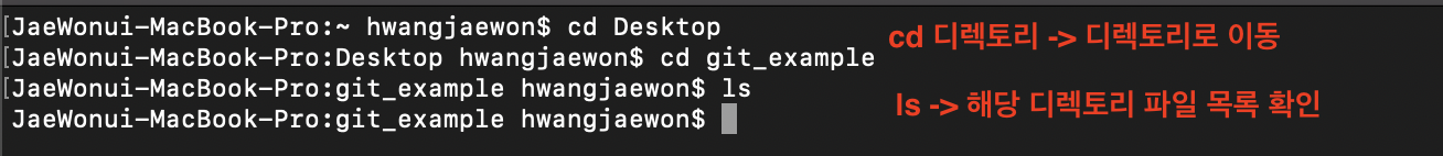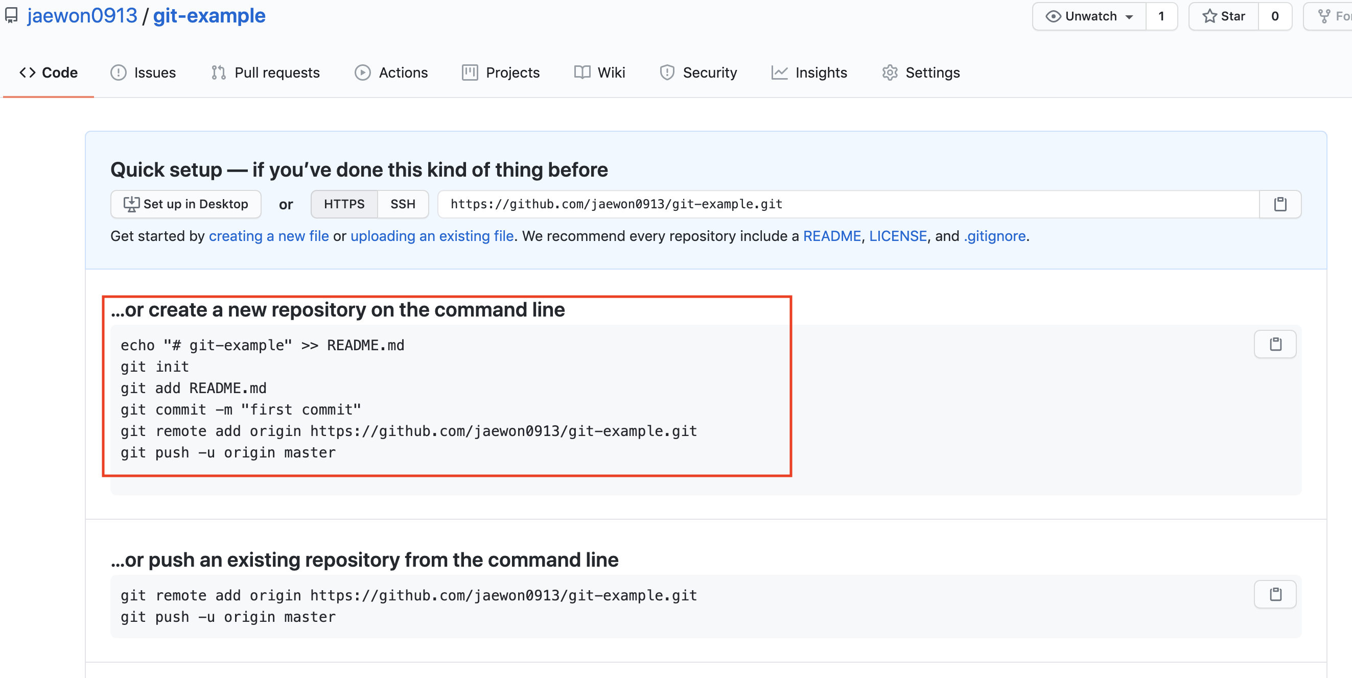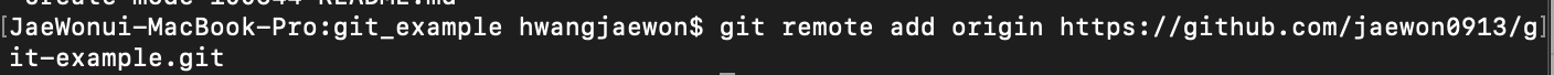 - git remote add origin https://github.com/jaewon0913/git-example.git 을 입력합니다. 이 작업은 디렉토리와 git repository를 연결해주는 작업이라고 생각하시면 됩니다.