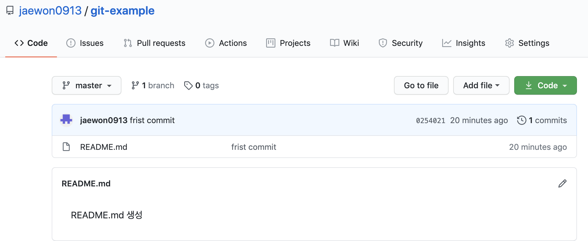 - "first commit" 이란 메시지와 함께 README.md 가 올라간 것을 확인하실 수 있습니다.