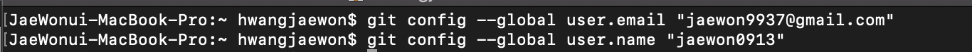 - 터미널에서 git config --global user.name "유저이름" / git config --global user.email "가입한@이메일.com" 을 입력합니다.