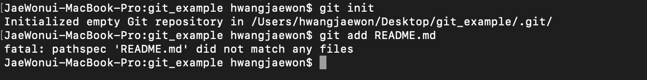 - fetal : pathspecd 'README.md' did not match any files -> 현재 디렉토리에 해당 파일이 없습니다.