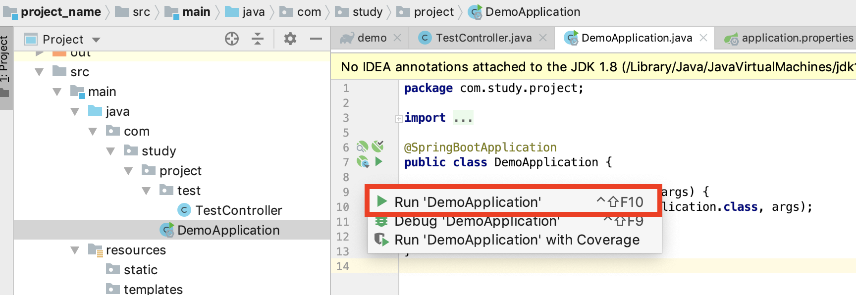 - DemoApplication.java 를 통해서 해당 프로젝트를 실행합니다.