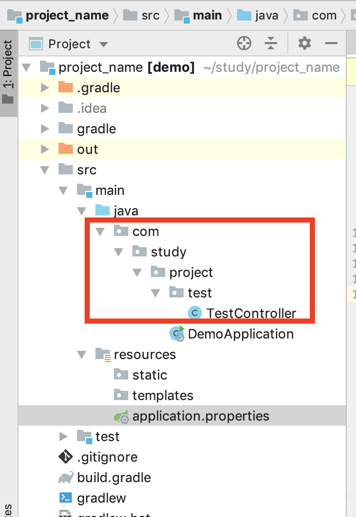 - project 패키지 아래에 test 패키지를 생성하고, TestController.java 파일을 생성합니다.