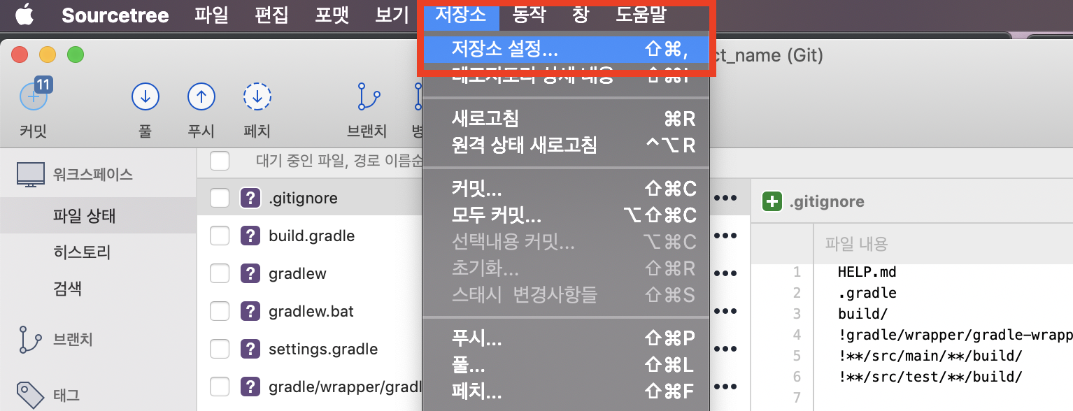 - Source Tree에서 위에서 연결한 프로젝트를 선택 후 상단의 저장소(Repostiory) -> 저장소 설정(Repository Setting) 을 선택합니다.
