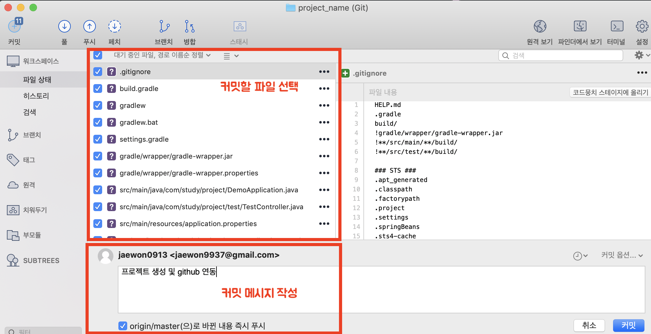 (하단 버튼은 커밋 시 바로 푸시 하도록 하는 버튼입니다.)
