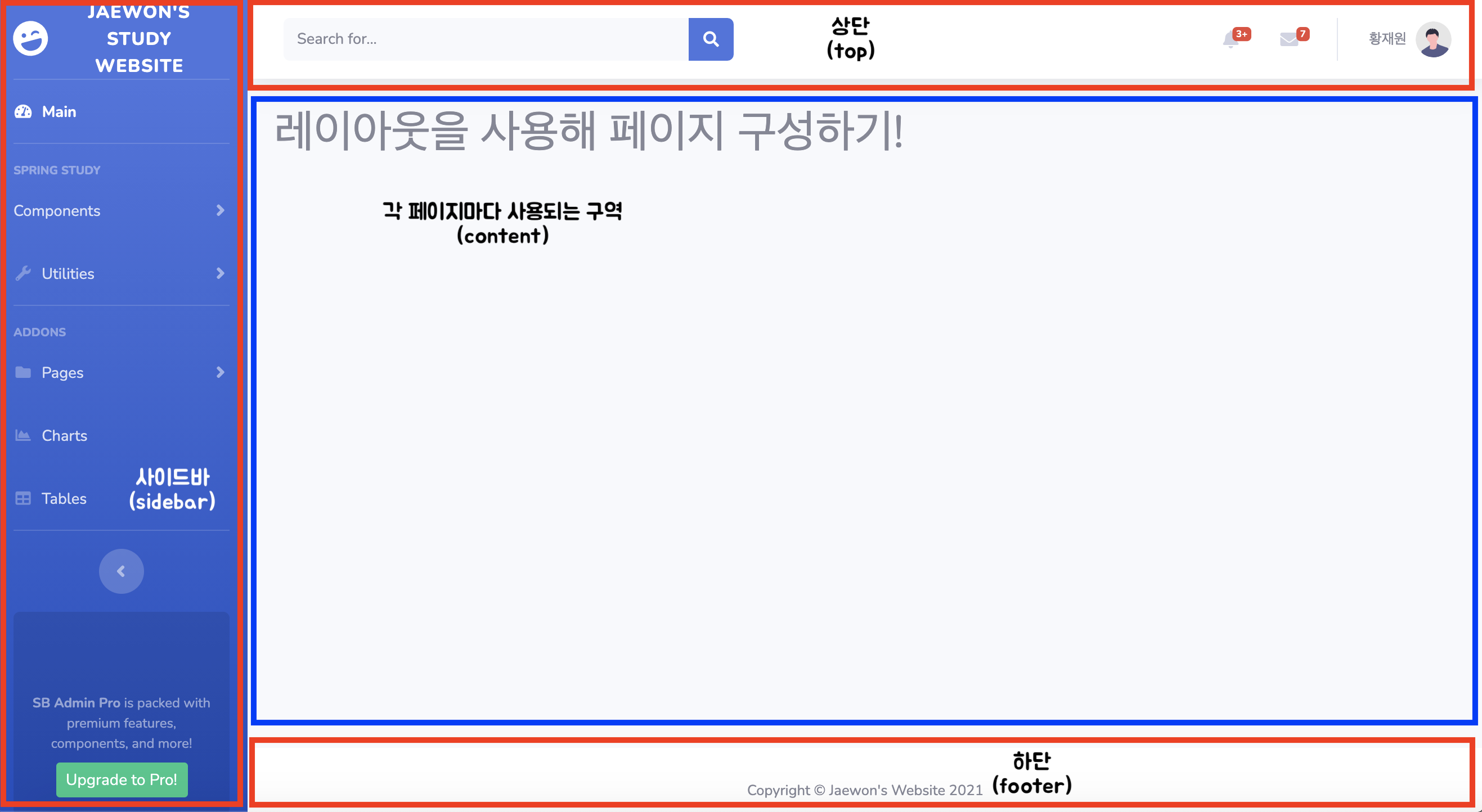 - 사이드바, 상단, 하단은 공통으로 모든 페이지에서 사용되는 곳이며, 가운데 content 부분은 각 페이지마다 바뀌는 곳이 됩니다.