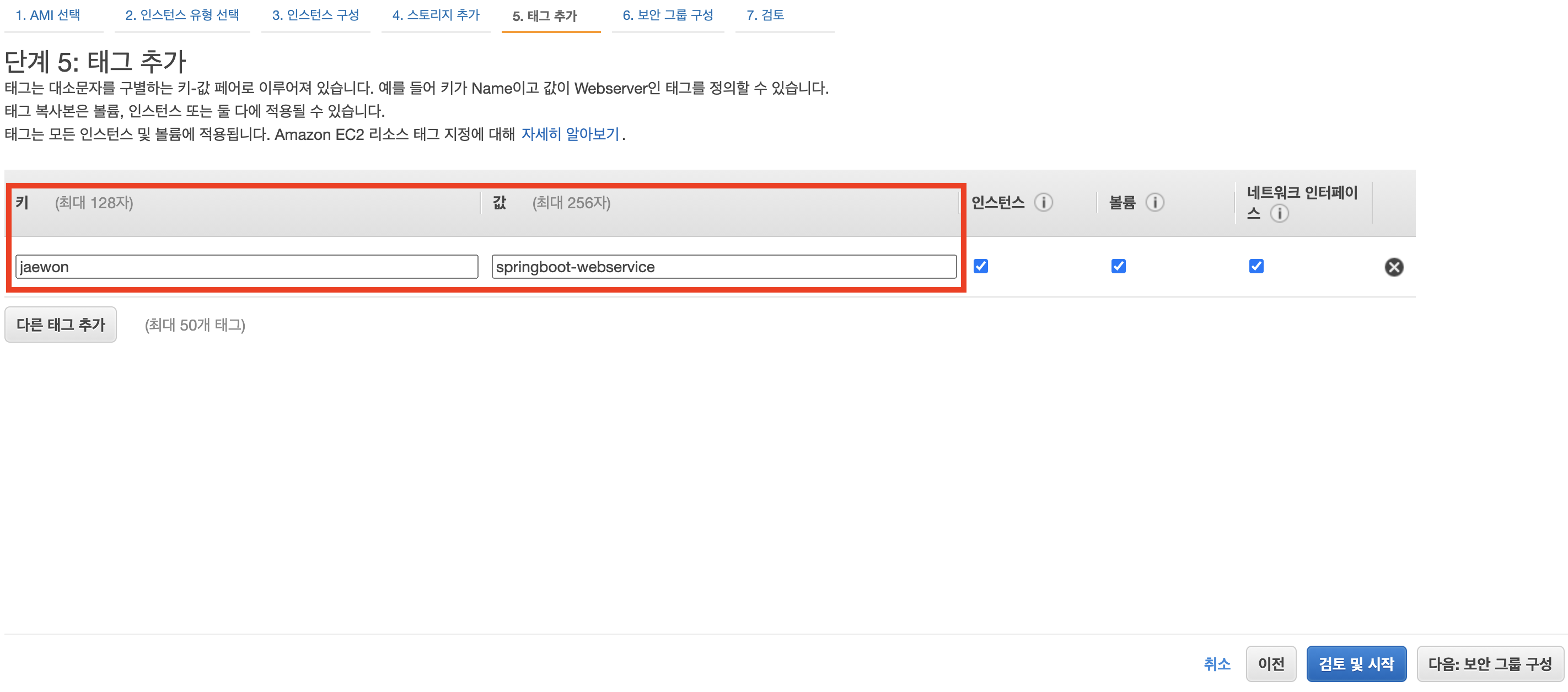 - 7단계 : 지금까지 인스턴스 생성을 위한 설정을 마지막으로 검토 합니다.