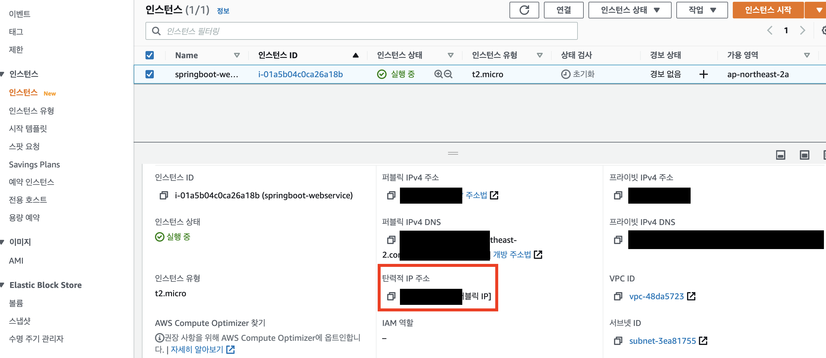 - 다시 EC2 인스턴스에서 탄력적 IP가 할당되었는지 확인합니다.