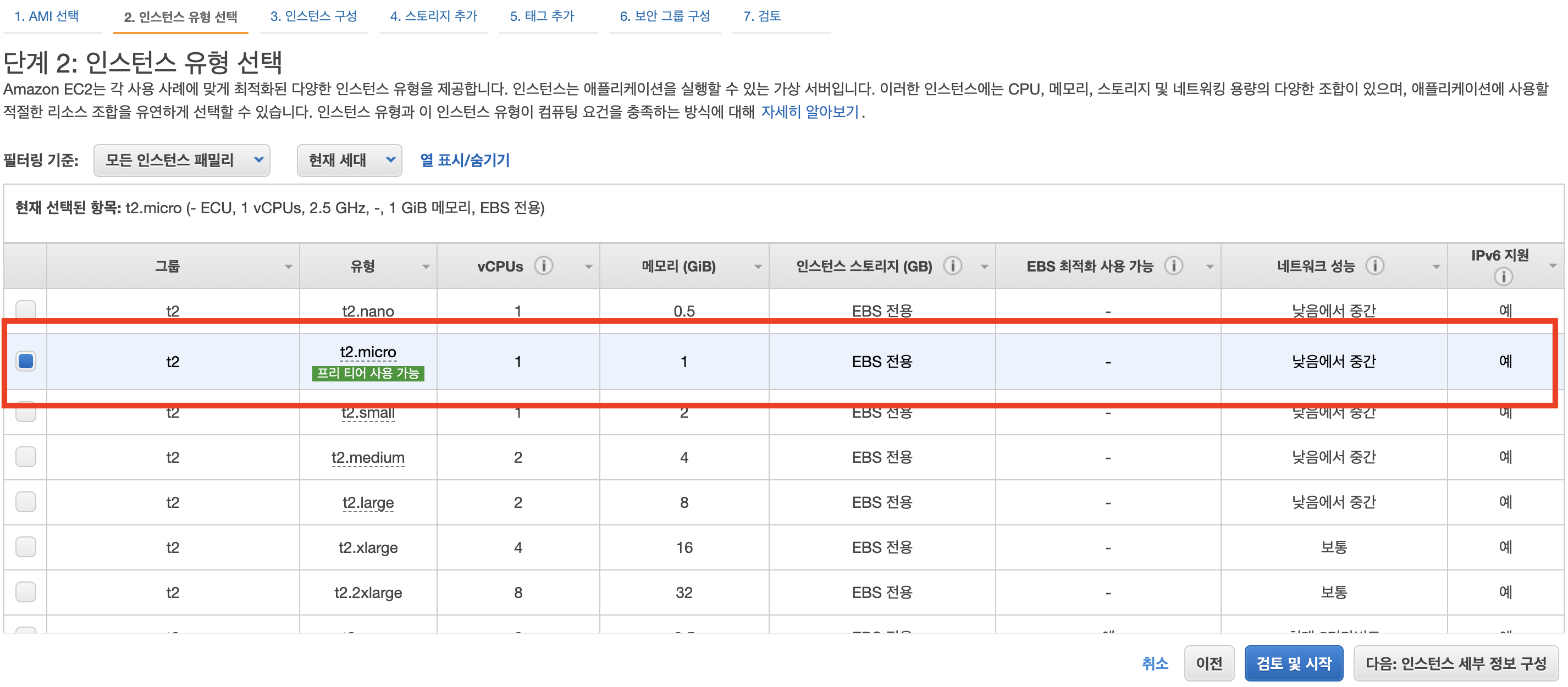 - 2단계 : 인스턴스 유형은 프리티어에서 사용가능한 "t2.micro" 를 선택 후, "다음:인스턴스 세부 정보 구성"을 클릭합니다.