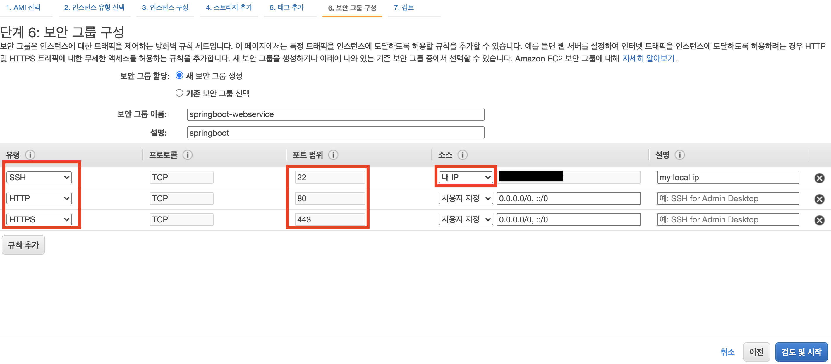 - 6단계 : 보안 그룹 생성에서는 해당 서버에 접속할 수 있는 IP를 설정합니다.