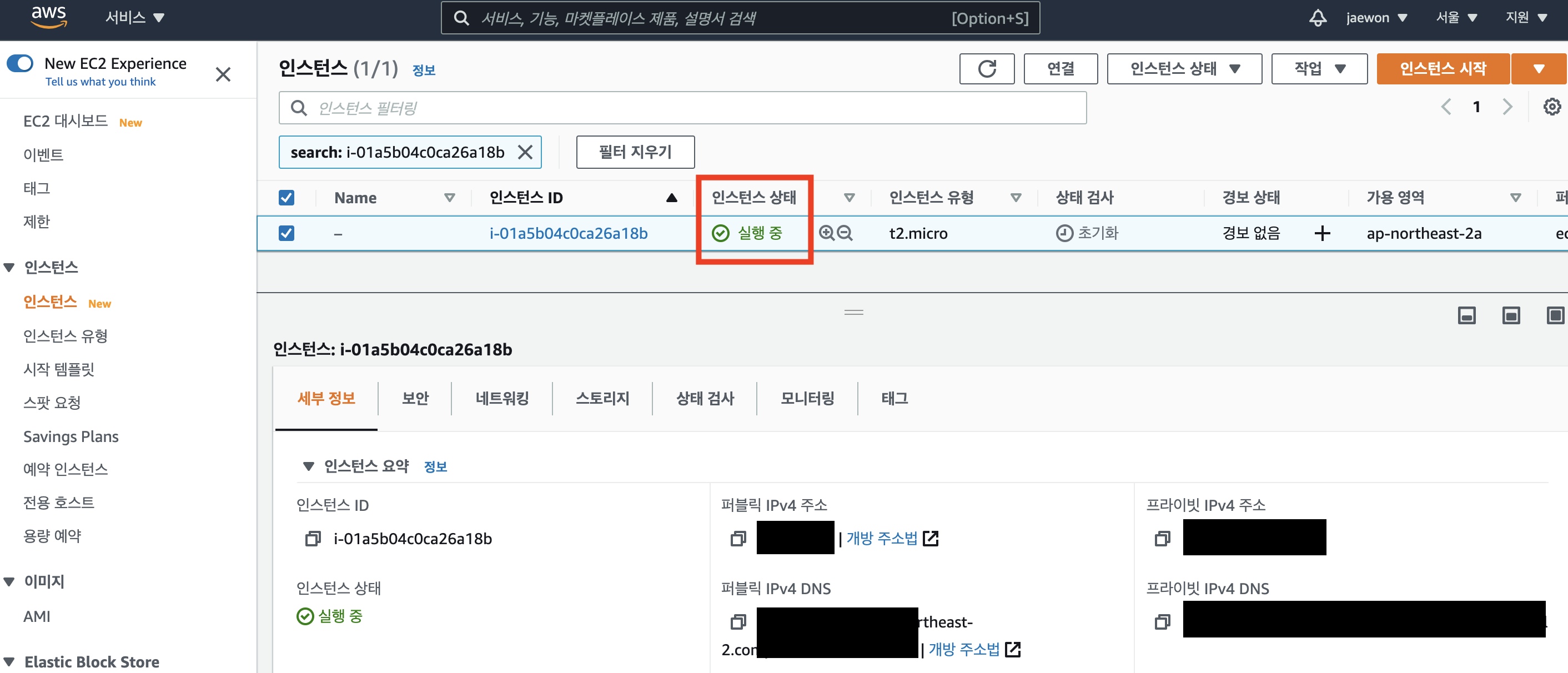 - 서버로 사용할 인스턴스 생성이 끝이 났고, 해당 인스턴스 ID를 클릭하면, 생성한 인스턴스 페이지로 이동합니다.