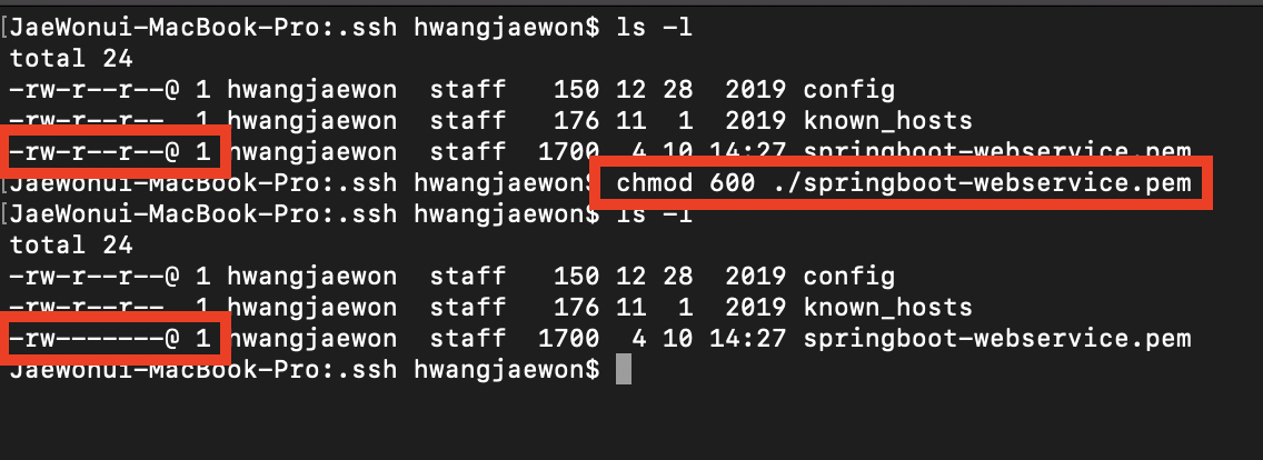 - 복사한 pem 파일의 권한을 변경합니다.