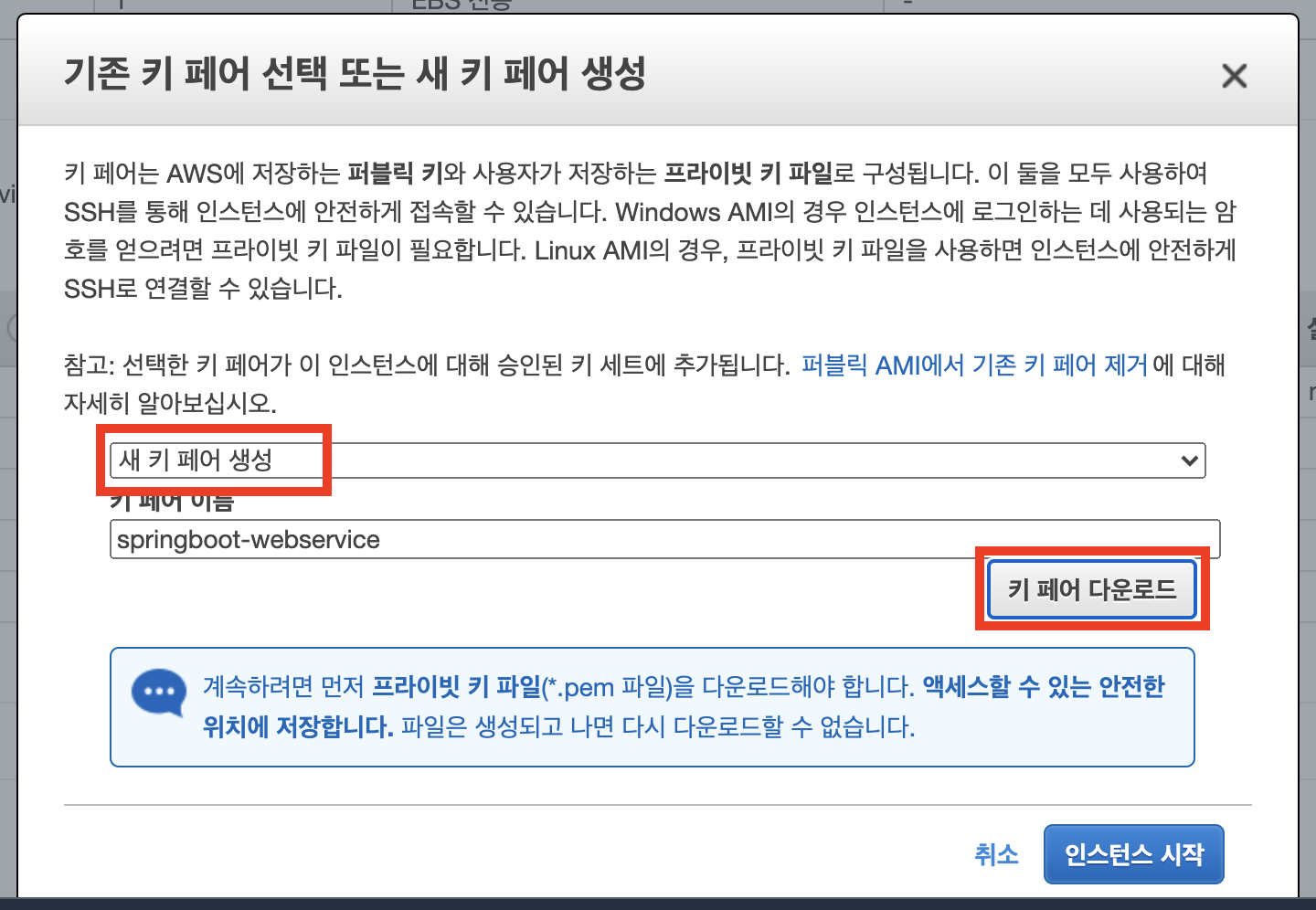 이 키페어를 통해 해당 인스턴스에 접근이 가능하므로, 잘 보관해야 합니다.