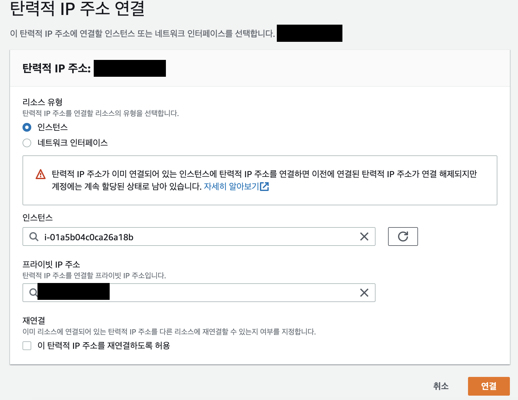 - "탄력적 IP 주소 연결"을 클릭합니다.