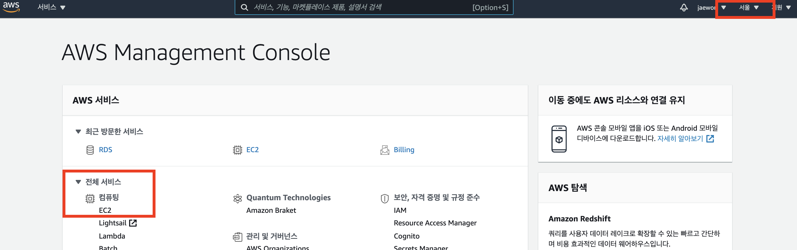 - AWS에 로그인 후 우측 상단에 지역이 서울이 아니라면 대한민국, 서울로 지역을 변경합니다.
