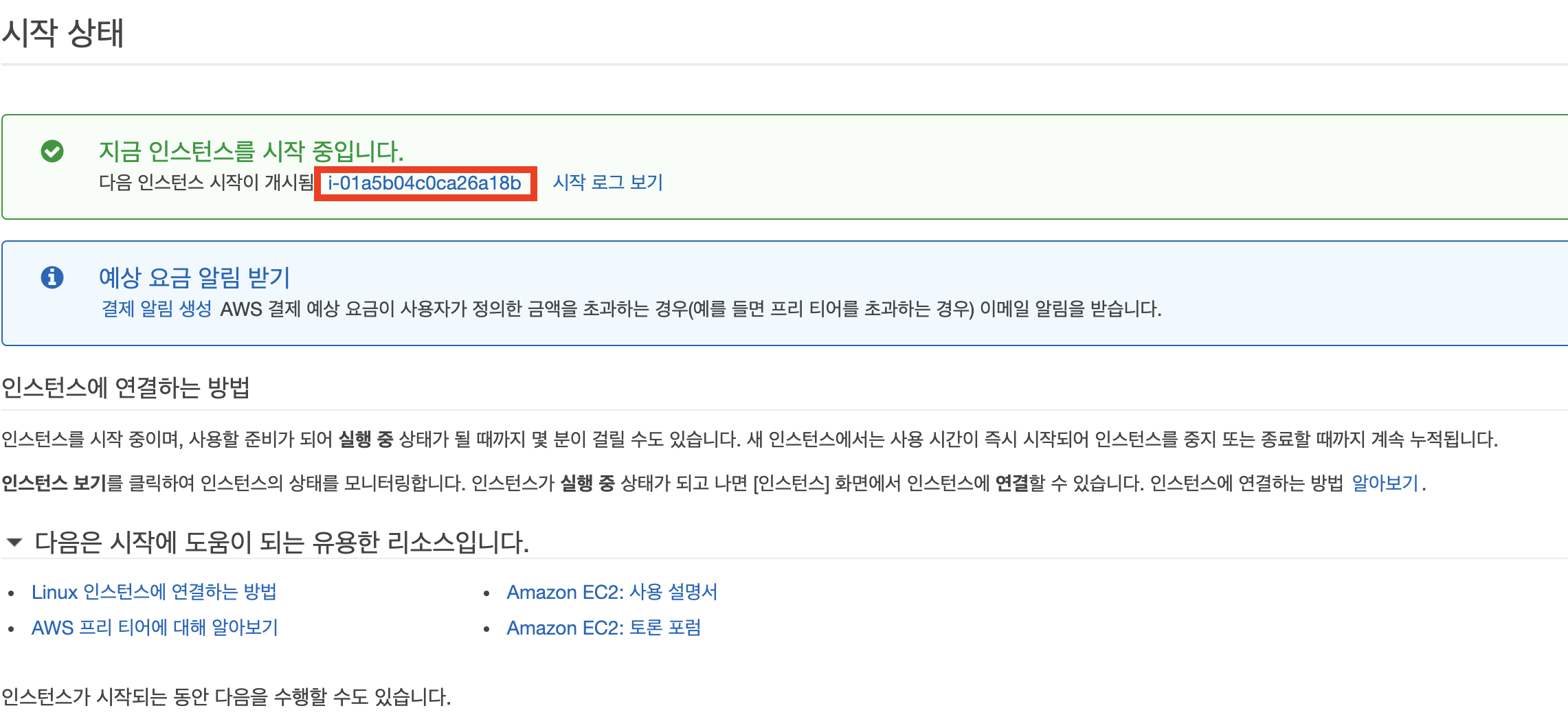 - 정상적으로 설정이 끝났다면, "시작하기"를 클릭하여 EC2 인스턴스를 생성합니다.