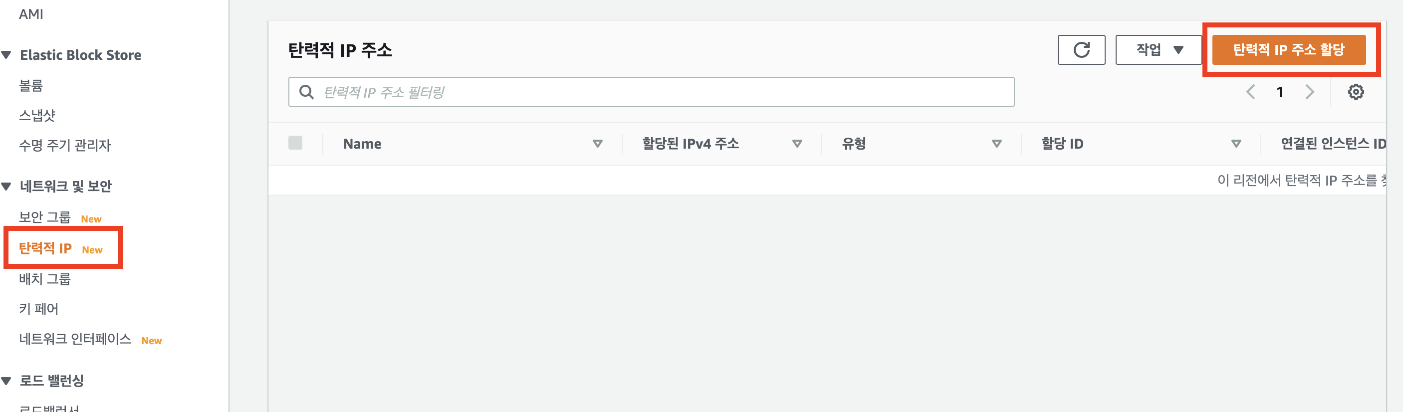 - "탄력적 IP 주소 할당"을 클릭합니다.