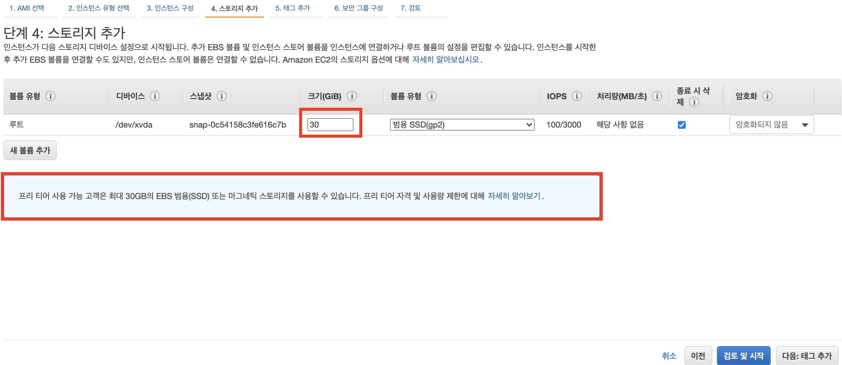 - 4단계 : 저장 용량을 설정합니다. 프리티어는 최대 30GB까지 무료로 사용할 수 있습니다.