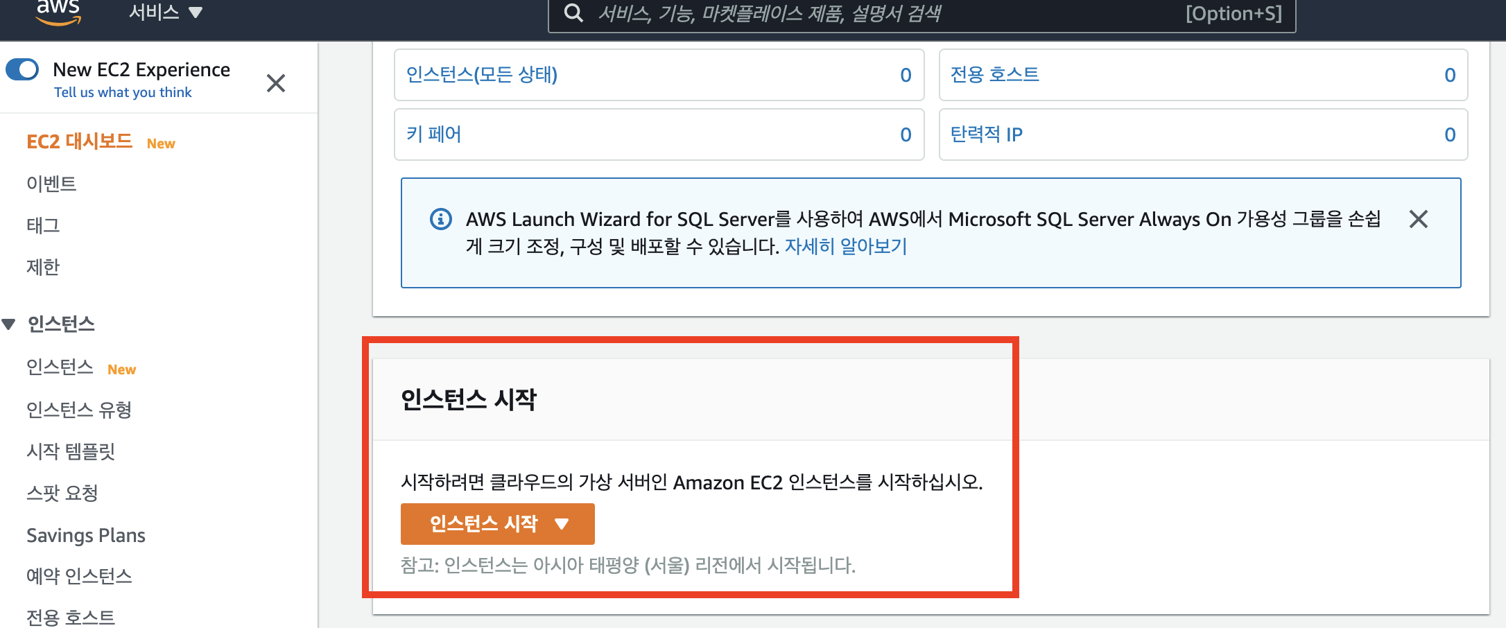 - 정상적으로 설정이 끝났다면, "시작하기"를 클릭하여 EC2 인스턴스를 생성합니다.