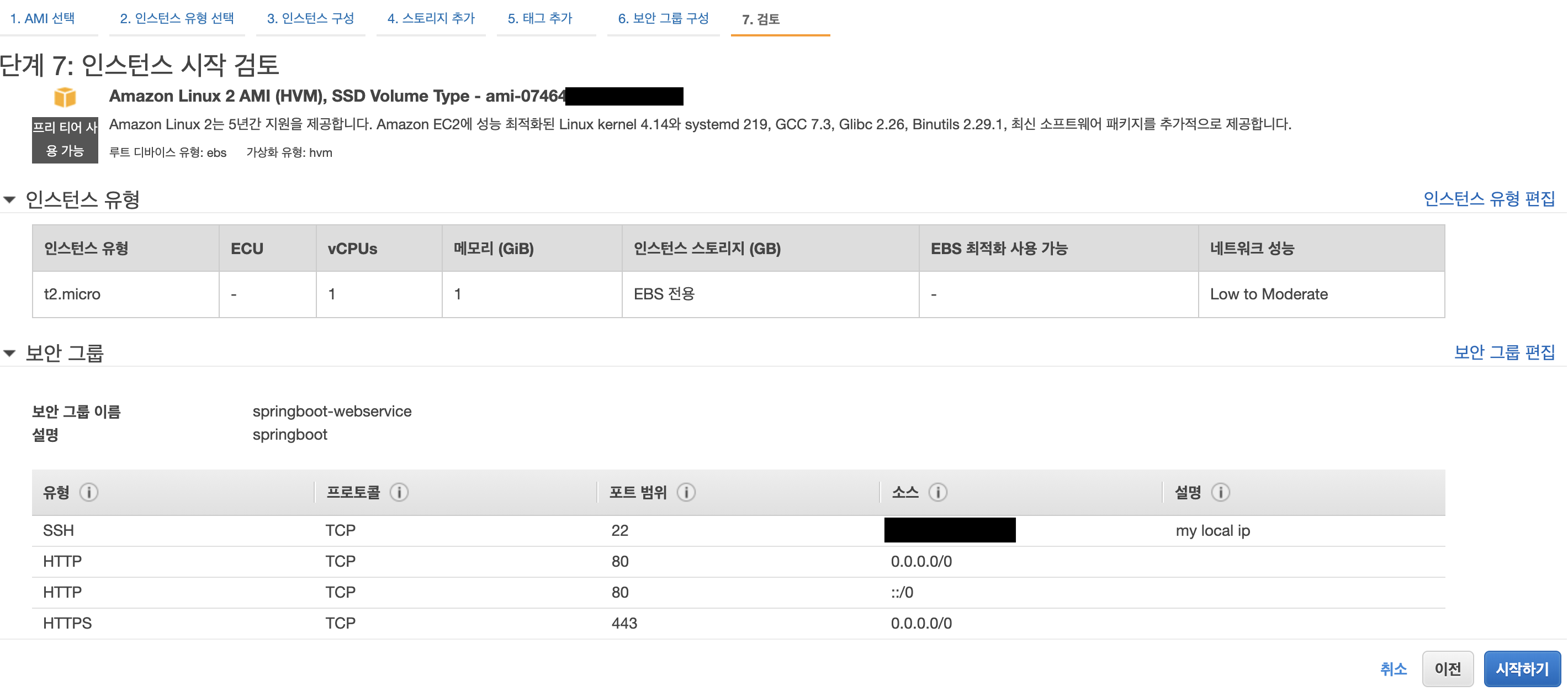 - 6단계 : 보안 그룹 생성에서는 해당 서버에 접속할 수 있는 IP를 설정합니다.