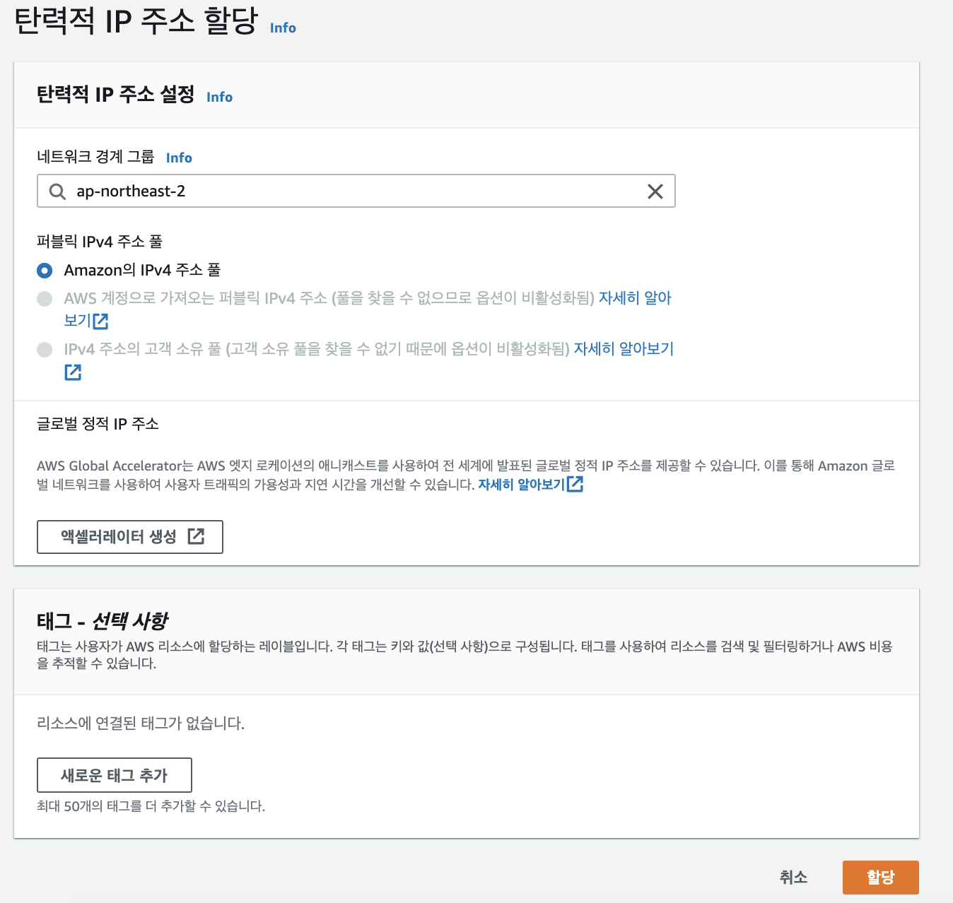 - 따로 설정없이, "할당"을 클릭하여, 탄력적 IP를 할당합니다.