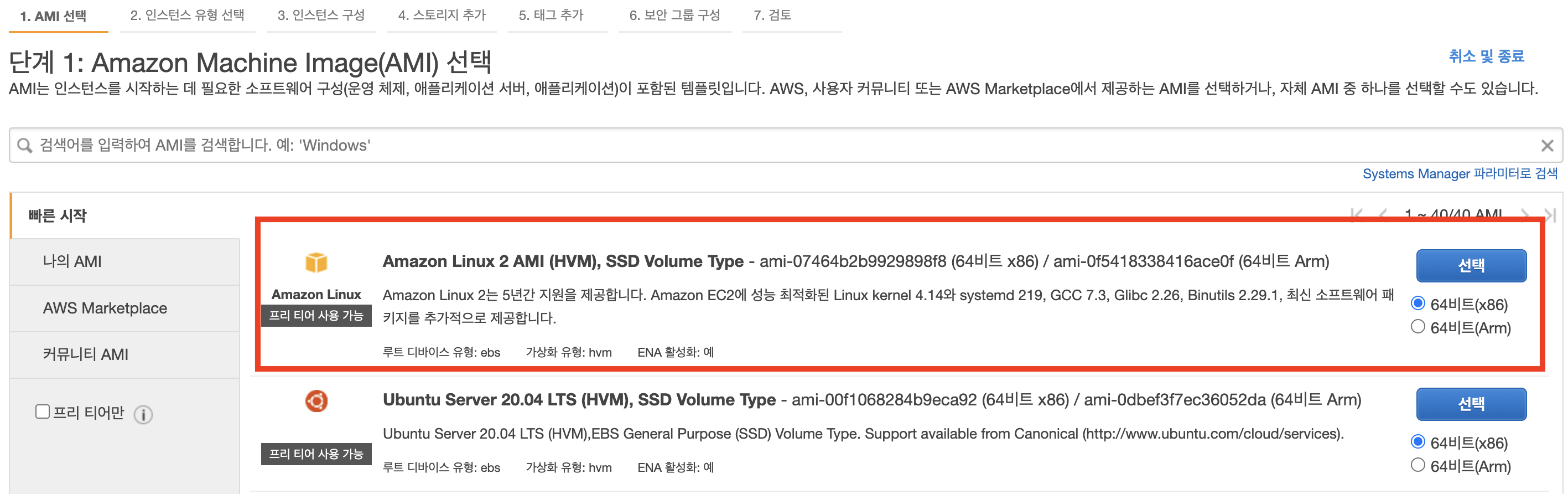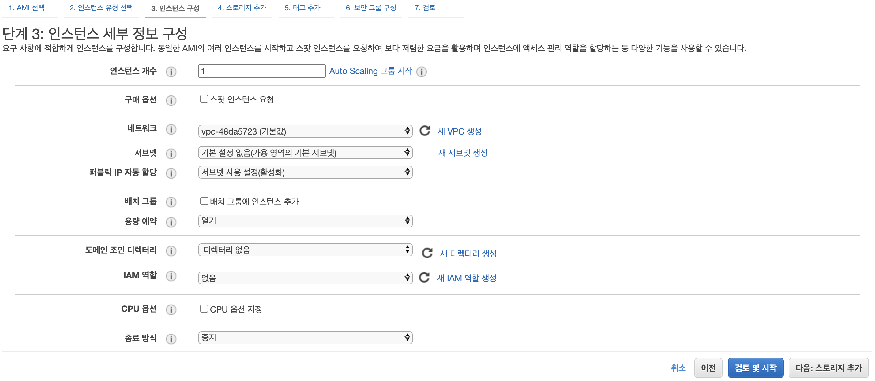 - 7단계 : 지금까지 인스턴스 생성을 위한 설정을 마지막으로 검토 합니다.