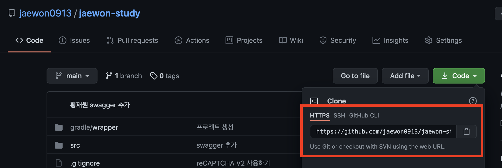 git clone 복사한 주소 (ex : git clone https://github.com/jaewon0913/jaewon-study.git)